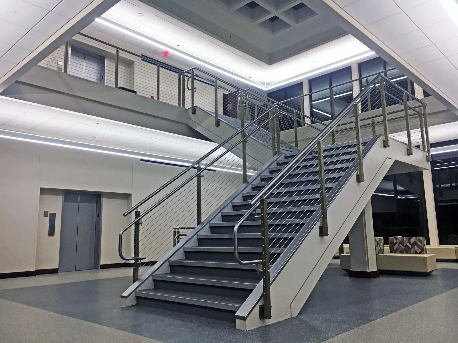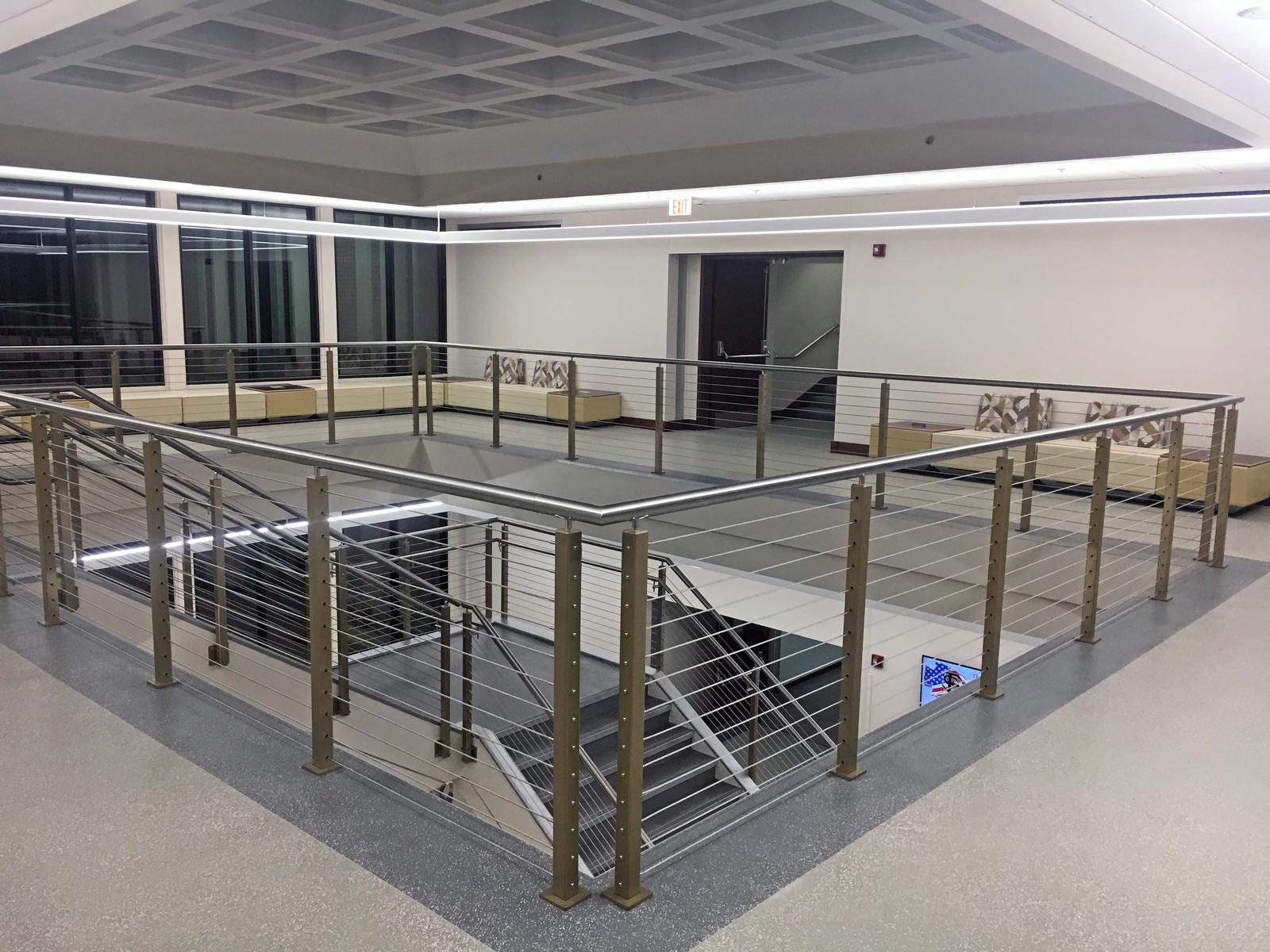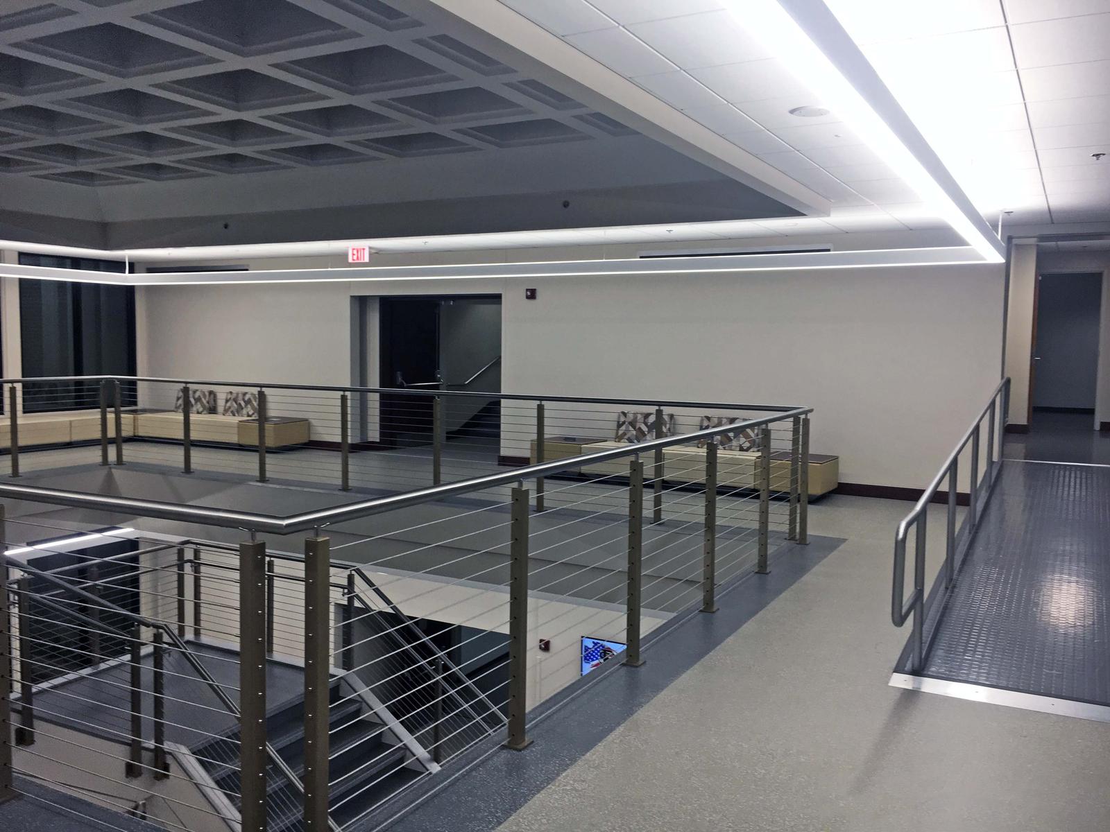 This project consisted of renovations to the existing atrium and included new finishes, acoustical ceilings, cable railing system, fire sprinkler relocations, electrical and lighting improvements, and new LVT flooring in the atrium and 1st and 2nd floor hallways.