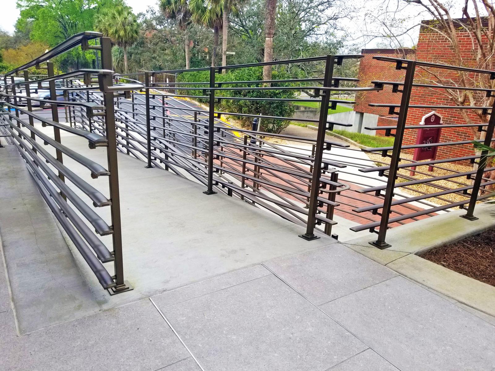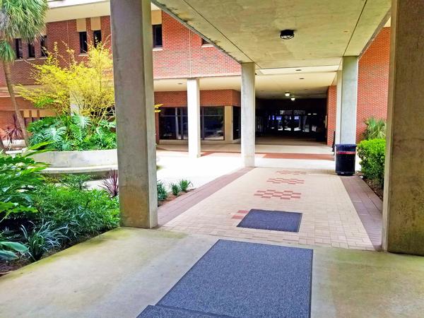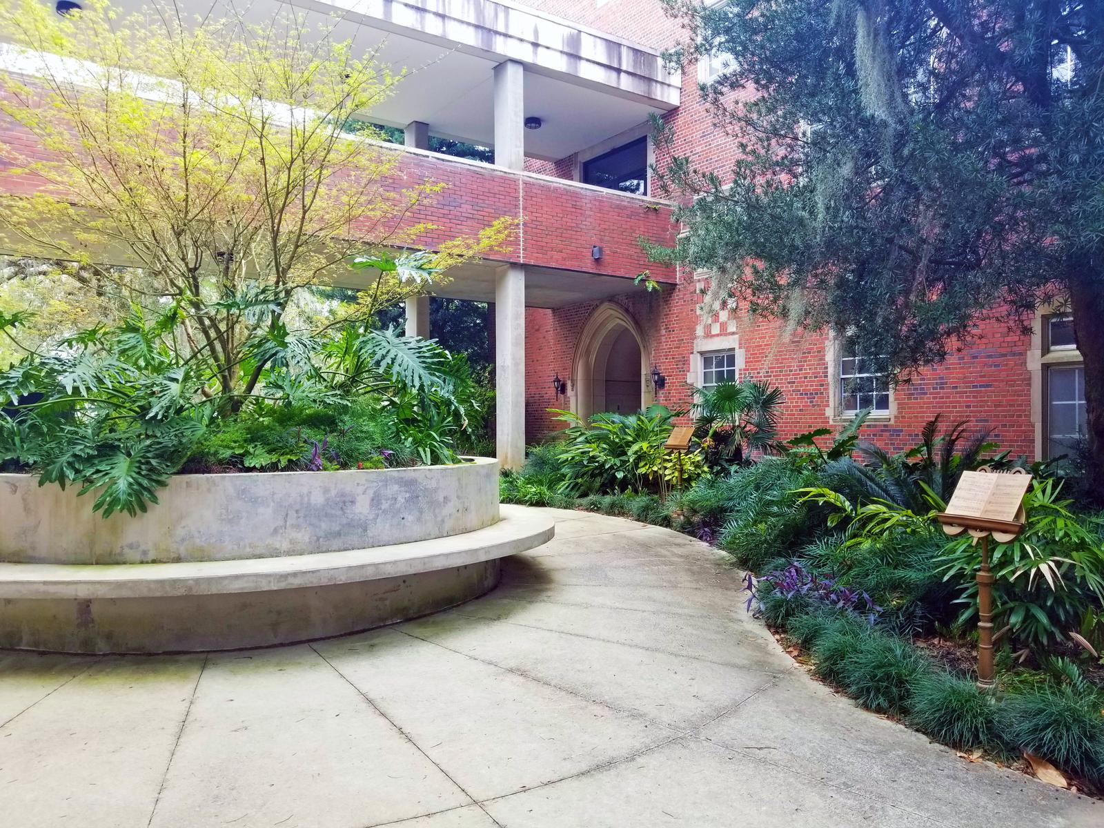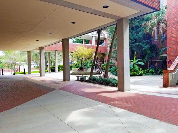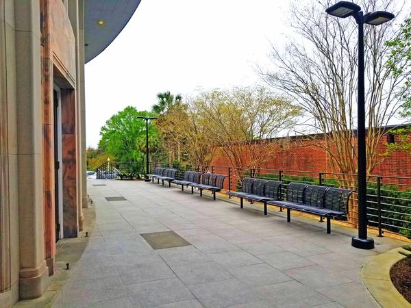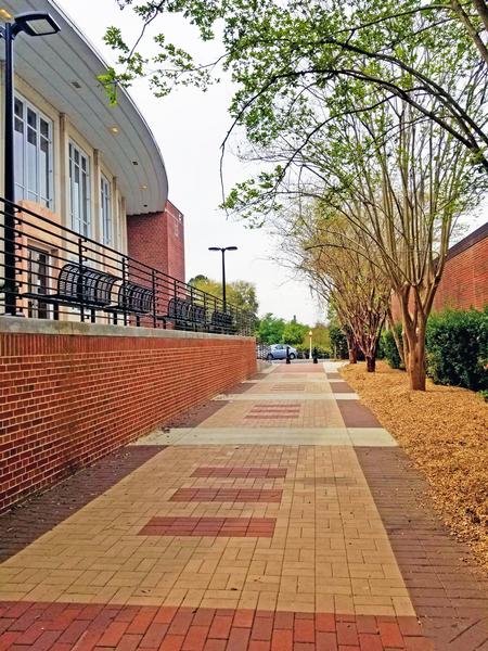The second project consisted of a complete remodel of the Opperman Music Hall exterior terrace and walkway to include a new concrete terrace with stone flooring, ADA access ramp, metal railing, CMU/brick masonry, a concrete and brick paver walkway with removable bollards, site drainage system, site furnishings, landscaping, and new light fixtures.